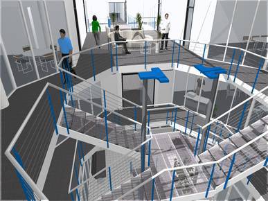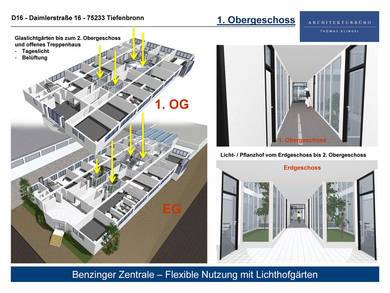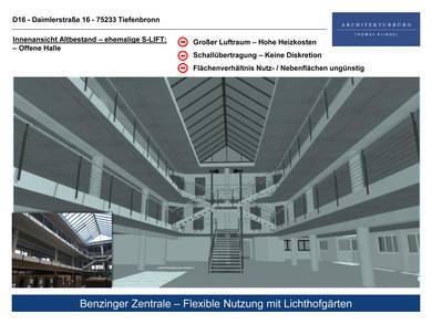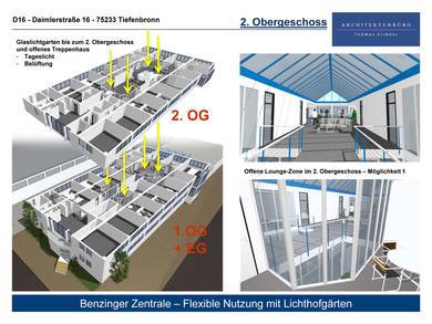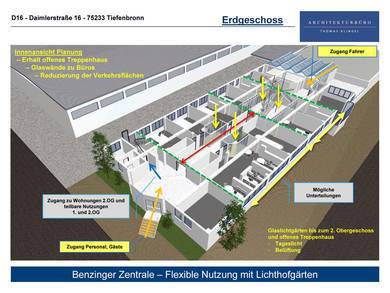 Visualisierung zum Umbau eines bestehenden Büro- und Ausstellungsgebäudes zur Zentrale Spedition Benzinger von Erdgeschoss bis 2. Obergeschoss.