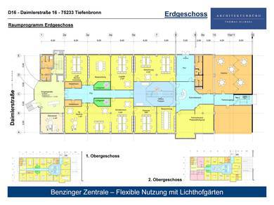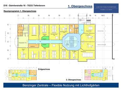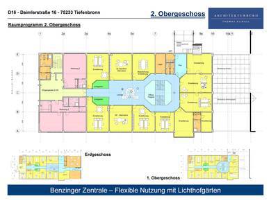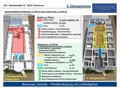 Die Räumlichkeiten im 2. Obergeschoss werden ebenfalls zur Mitte verlängert, geteilt durch den zwischen den Lichthofgärten liegenden Flur. Eine Teilung der Büroflächen wird durch Trennung von