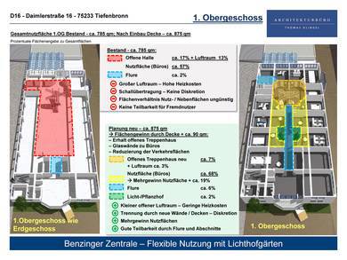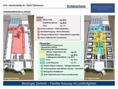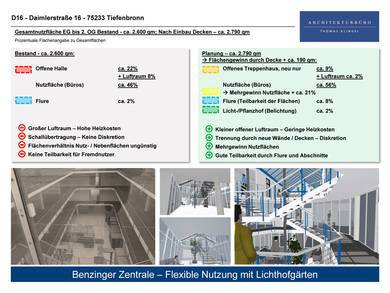 Erweiterung der Grundflächen im 1. und 2. Obergeschoss durch Schließung der Halle unter Erhalt des bestehenden Treppenhauses. Verglasung der den im Innenraum liegenden Lichthöfen zugewandten Innenwände zur Ermöglichung einer ausreichenden Belichtung über das Oberlicht. Verringerung der Heizkosten durch Herstellen von geringeren Lufträumen mit gleichzeitiger Beibehaltung der Belichtung. Einfachere Teilbarkeit der Nutzfläche in Bürobereiche durch Flure und Abschnitte. Eindämmung der Schallausbreitung aufgrund von Raum- und Deckenabschlüsse. Effizientes Verhältnis von Nutzflächen zu Nebenflächen.