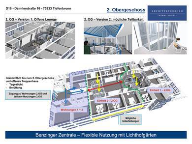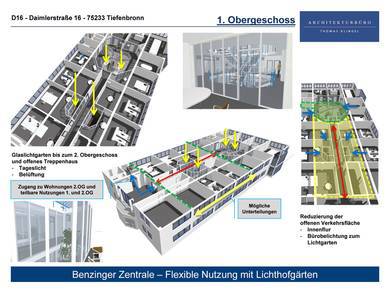 genügende Raumbelichtung der Büros erreicht wird. Die Räumlichkeiten an der Vorderseite des Gebäudes sind weiterhin mit Nutzung als Wohnungen geplant.