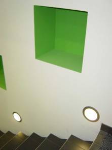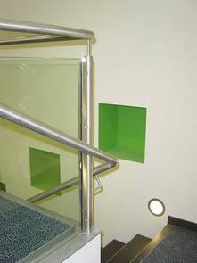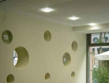Die Fassade des Erdgeschosses wurde als Aluminium-Pfosten-Riegel Konstruktion erneuert. Die im Windfang liegende SB-Zone erhielt eine Alu-Konstruktion mit