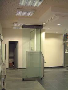 und eine neue horizontale Schiebewand HSW-Anlage) installiert. Diese besteht aus einem Festteil mit Glasausschnitt für den Geldautomaten, vier Schiebeflügel und zwei Endflügeln mit Bodenlager.
