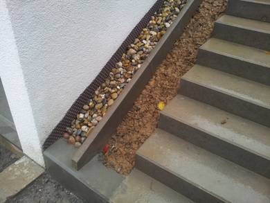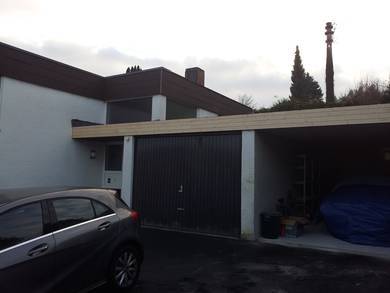 An eine im Bestand schon vorhandene Garage wurde eine weitere im gleichen Stil angebaut. Die gesamte Zufahrtsfläche beider Garagentore wurde freigelegt und anschließend asphaltiert. Für den Zugang zum Garten wurden Blockstufen aus Beton verlegt. Ein zu steiles Gefälle im Gelände wurde durch den Einbau von Stützwinkel verhindert.